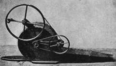 An ingenious form of bellows, giving a continuous blast,was in use in the early years of the nineteenth century. It has adrum-shaped body narrowing into a square channel that ends in a brassnozzle. Inside the drum is a wheel with floats. Outside there is anarrangement of two wheels with driving bands, the larger with a handle,which turn the wheel within, the multiplied power making a steadydraught. There is an old saying among cottage folk in Sussex descriptiveof some situation that is full of difficulty or almost hopeless: "It is acase of green wood and no bellows."