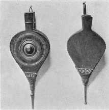Bellows have been in use for all time, but from their construction ofwood and leather and from the need of their constant employment they hadnecessarily a rather short lifetime, and examples of those in common usedating further back than a hundred and fifty years are rare, thoughthere are much older specimens in museums of a highly ornamentalkind, in which both wooden faces were richly carved. The oldest weknow of for ordinary household use had much longer handles and shorterbodies than the later patterns. A good kind of the late eighteenth andearly nineteenth centuries had the turned body of a. dark hardwood, asshown in one of the examples illustrated. This had a nicelyformed brass nozzle, and was altogether a shapely article. The ordinarykitchen bellows with elm body that is still to be had follows this, though oncoarser lines.