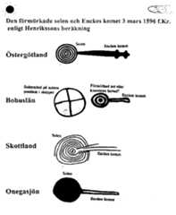 4)Likheterna mellan den teoretiska bilden och hällristningarna är vanligen besvärande måttliga. För exempelvis den 3 mars 1596 f.Kr. har Henriksson beräknat att kometen Encke befinner sig 8-9o från den förmörkade solen, dvs omkring 17 soldiametrar (solens skenbara diameter på himlavalvet är omkring en halv grad). På de hällristningar från Sverige, Skottland och Ryssland han framhåller som avbildningar är i minst tre, eventuellt alla fyra fallen kometen fäst vid solskivan (se figur 3). Hur är det möjligt att geografiskt och kulturellt vitt skilda hällkonstnärer har gjort samma kraftiga och omotiverade förvrängning av vad de har sett? När Henriksson låter fyra skålgropar symbolisera stjärnhopen Plejaderna är det också svårt att följa honom. För blotta ögat är betydligt fler stjärnor synliga. Kan då inte lika gärna två, tre eller tio skålgropar i grupp också föreställa Plejaderna. Vem kan avgöra det idag? Dessa måttliga likheter och ibland slumpmässiga, ibland systematiska avvikelser från den astronomiska verkligheten minskar väsentligt trovärdigheten i Henrikssons tolkningar.