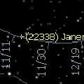 | Click for a motion trail plot for 22338 Janemojo for the next twelve months, bySkytools Also aZ view and anoblique view of its orbit, made by Carter Robertsusing Voyager III |