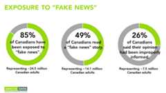 • We estimate that about 24.5 million Canadian adults have been exposed to “fake news” and 14.1 million have read content. About 7.5 million have said their opinion had been improperly informed because of the “fake news” they read.