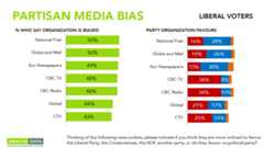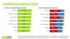 • We asked about perceived biases of different media outlets, and in most cases, roughly half saw no bias. The tendency was to see a Liberal bias at CBC, a Conservative bias at the National Post and Sun Newspapers, a slight tendency to see a Liberal bias at the CTV and Global, and mixed opinions about the Globe and Mail.