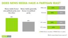 • On the question of media bias, 58% think “the news media generally favour one political party over another, with Conservative voters 15 points more likely to feel this way than Liberal voters (69% versus 54%). Millennials were also far more likely than average to perceive a bias, as are residents of Alberta.