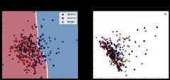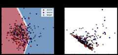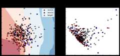 defshow_results(model,is_src_only=False):ys_pred=model.predict(Xs)yt_pred=model.predict(Xt)acc_s=accuracy_score(ys,ys_pred>0.5)acc_t=accuracy_score(yt,yt_pred>0.5)yp_grid=model.predict(X_grid).reshape(100,100)Xs_enc=model.transform(Xs)Xt_enc=model.transform(Xt)pca_enc=PCA(2).fit(np.concatenate((Xs_enc,Xt_enc)))Xs_enc_pca=pca_enc.transform(Xs_enc)Xt_enc_pca=pca_enc.transform(Xt_enc)cm=plt.cm.RdBufig,(ax1,ax2)=plt.subplots(1,2,figsize=(12,5))ax1.set_title("PCA input space")ax1.contourf(x_grid,y_grid,yp_grid,cmap=cm,alpha=0.6)ax1.scatter(Xs_pca[ys==0,0],Xs_pca[ys==0,1],label="source",edgecolors='k',c="red")ax1.scatter(Xs_pca[ys==1,0],Xs_pca[ys==1,1],label="source",edgecolors='k',c="blue")ax1.scatter(Xt_pca[:,0],Xt_pca[:,1],label="target",edgecolors='k',c="black",alpha=0.5)ax1.legend()ax1.set_yticklabels([])ax1.set_xticklabels([])ax1.tick_params(direction='in')ax2.set_title("PCA encoded space")ax2.scatter(Xs_enc_pca[ys==0,0],Xs_enc_pca[ys==0,1],label="source",edgecolors='k',c="red")ax2.scatter(Xs_enc_pca[ys==1,0],Xs_enc_pca[ys==1,1],label="source",edgecolors='k',c="blue")ax2.scatter(Xt_enc_pca[:,0],Xt_enc_pca[:,1],label="target",edgecolors='k',c="black",alpha=0.5)ax2.set_yticklabels([])ax2.set_xticklabels([])ax2.tick_params(direction='in')ifis_src_only:fig.suptitle("%s - Source Acc :%.3f - Target Acc :%.3f"%("Source Only",acc_s,acc_t))else:fig.suptitle("%s - Source Acc :%.3f - Target Acc :%.3f"%(model.__class__.__name__,acc_s,acc_t))plt.show()