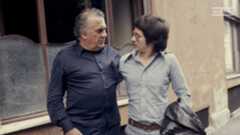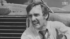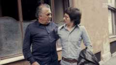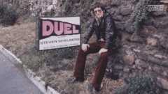 1 / 2Steven Spielberg seated on the side of a road in Italy next to a sign for "Duel" during the film's European theatrical release.