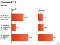 The OpenGL test in Xbench doesn’t do much to really tax the GPU hardware, but the OpenGL scene rendering test in Cinebench R11.5 shows the NVIDIA 320M turning in performance much closer to the 15″ MacBook Pro than the 9400M in the previous generation MacBook Air. Given Mac OS X’s reliance on the GPU for much of its eye candy, as well as Apple increasingly leveraging the GPU for its software, the decision to stick with the 320M over better CPU performance shows some dividends here.