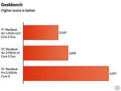 Looking at the Geekbench scores, the 11″ MacBook Air clearly isn’t winning any speed contests. The 1.4GHz ULV CPU is further limited by an 800MHz front-side bus, so memory access is also slower compared to the 13″ MacBook Air’s 1066MHz FSB. With a faster bus and a 50 percent faster CPU, the previous-gen Air manages a 28 percent better score. It’s not even a fair fight with the Core i5 MacBook Pro, though—with the capability of running four threads simultaneously anddirect connection between CPU and RAM, it easily stomps the 11″ MacBook Air.