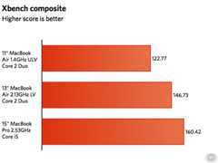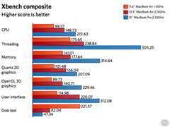 Xbench paints a more interesting picture. The 11″ MacBook Air manages a mediocre 123 points composite score, but the 13″ only tops that score by 20 percent. The 15″ MacBook Pro only turns in a 30 percent better score, despite having about double the raw CPU power. Taking one look at the disk test reveals exactly what an equalizer the newly designed SSD modules are for the new Air models. The 11″ MacBook Air had about three times the performance of the SSD in last year’s 13″ MacBook Air, and close to five times the performance of the spinning platter in the 15″ MacBook Pro.