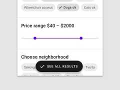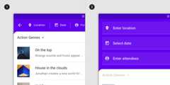Another fun new layout option is the “Backdrop” pattern, which places a background control layer behind a foreground content layer. The background control is partially exposed as a bar at the top of the screen, displaying contextual information about the content layer (often search result options). You can scroll the front contextual layer like normal, but if you tap on the bar, the foreground content layer will slide down, exposing more of the background layer and more control and display options.
