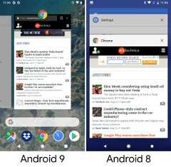 App thumbnails now scroll horizontally instead of vertically. They are now full-screen thumbnails rather than the vertically truncated thumbnails of Android 8.0, and they no longer overlap. You can now see the whole app thumbnail at once, but text is still big enough that it can be easily read, without re-opening the app. This is great for things like double-checking some navigation directions or quickly referencing an open note.