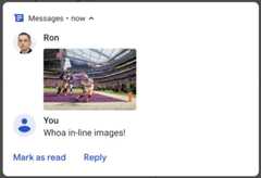 Messaging notifications—the kinds generated by texting with SMS, Hangouts, WhatsApp, and other apps—get a few special features in Android Pie. Message notifications are now threaded, so if you have a rapid-fire texting session, the last few replies will show up in the notification. The threaded notifications look just like a mini texting app, complete with contact pictures on either side of the message. The messaging notification can also show pictures in-line, so instead of a “picture,” you can see a tiny thumbnail right in the notification panel.