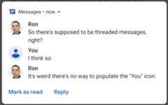 The one oddity with threaded messaging is that, while your contact’s picture will show up, there seems to be no way to set a contact icon for yourself. No matter what I do (in Android Messages, at least), I always get a placeholder image.