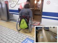 段差・隙間解消が行われているものの、以外と急勾配、安全のためさらに車いす用渡し板を設置していただきました。