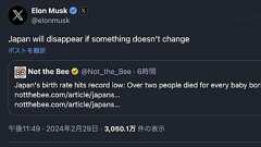 実業家のイーロン・マスク氏は日本時間2月29日夜、「もし何も変わらなければ、日本は消滅するだろう」と...実業家のイーロン・マスク氏は日本時間2月29日夜、「もし何も変わらなければ、日本は消滅するだろう」とX(旧Twitte)に投稿した。2023年の日本の出生数が75万8631人(速報値)と、統計開始以来の過去最少を更新したことを受けた投稿だ。
