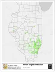 The map below shows oil (in green) and natural gas (in red) fields in Illinois as of May 2017.