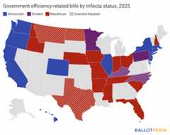 Ballotpedia has tracked70 state bills related to government efficiency in 2025. As of Oct. 7,11 of these bills were enacted, including Texas’ SB 14. Of these 11 bills: