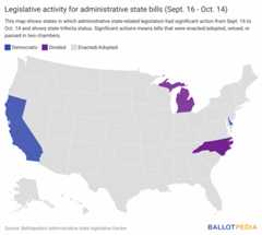 Since our last newsletter edition,Ballotpedia tracked significant legislative action (enactments, vetoes, and passage through both chambers) in four states on30 bills related to the administrative state. Four states (CA, DE, MI, NC) enacted or adopted 24 bills; one state (CA) passed two bills in both chambers; California Governor Gavin Newsom (D) vetoed two bills and North Carolina Governor Josh Stein (D) vetoed