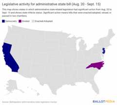 Since our last newsletter edition, Ballotpedia tracked significant legislative action (enactments, vetoes, and passage through both chambers) in three states on23 bills related to the administrative state. One state (NJ) enacted or adopted a bill; one state (CA) passed 20 bills in both chambers; and North Carolina Governor Josh Stein (D) vetoed two bills.