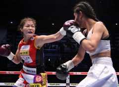 WBO女子世界S・フライ級タイトルマッチ10回戦は、王者の吉田実代(EBISU K’sBOX)が挑戦者シー・リーピン(中)に3-0判定勝ち。初防衛に成功した。スコアは98-91、97-92、99-90。