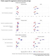 - We note that the relationship between age and support for violence among Democrats may be confounded by ideology. Specifically, younger Democrats are also ideologically more liberal than are older Democrats. However, when we predict support for violence in a logit model using self-reported ideology (a seven-point scale) and age group (18–34 years old or not), age group is a statistically significant predictor of all eight potential actions against CEOs or in the name of economic justice (ideology is also significant on 7 of 8 estimates). In short, younger Democrats are more willing to endorse violence even when we take ideology into account.