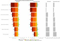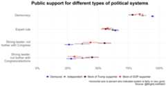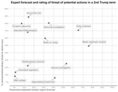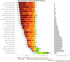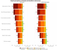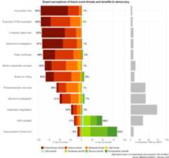 The left panel of the figure below shows expert ratings of the perceived benefits and threats to democracy. Events are listed in descending order based on the percentage of experts who rate them as a threat to democracy. (The right panel shows the percentage of respondents who rated the scenario as neither a threat nor a benefit to democracy.)