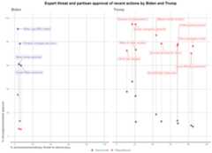 We asked our public sample whether they approved or disapproved of the actions taken by Biden and Trump that experts rated as potential threats or benefits to democracy. The figure below plots the percentage of Democratic and Republican participants in our public sample who strongly or somewhat approve of the events in question (on the vertical axis) against the percentage of experts rating each action as a serious or extraordinary threat to democracy (horizontal axis).