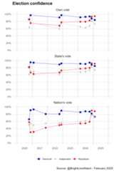Finally, although Republicans rated U.S. democratic performance more positively after Trump’s election win, they perceive more declines than improvements across the 30 principles we measured from November 2024 to February 2025. Three of these declines are statistically significant: that law enforcement investigations are not politically compromised (12 percentage points), that opponents’ patriotism is not questioned (13 points), and that campaign contributions do not influence policy (10 points). On these items, even Republicans appear to recognize a substantial decline in the early days of Trump’s second presidency (though we cannot rule out that Republicans are responding to messages about the Biden administration from Trump and his allies).