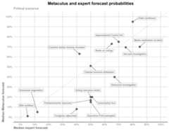 The figure below reports median estimates from political science experts and Metaculus forecasters on a 0–100% scale. (We also asked experts and forecasters to rate a list of non-political questions from Metaculus that are listed in the appendix; these are included in a version of this graph provided in the appendix.)