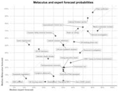 - The appendix includes a figure showing the distribution by date of forecasts from political science experts and from the Metaculus forecasters on each item. The expert forecasts were mostly collected in a few days after our main survey invitation while the Metaculus forecasts are more uniformly distributed across the data collection period. As a result, the Metaculus sample enjoyed an informational advantage on items where salient facts were changing over time – for example, on the Patel confirmation.