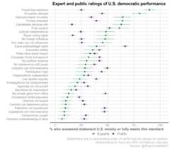 We offer several observations about these results. First, experts rate U.S. democratic performance highest in the areas of elections (for example, that they are free of fraud, that all parties are allowed to compete, and that candidates disclose information about how they will govern) and freedom of expression (for example, that citizens can express their opinions and that rights to free speech and to political protest are protected). Although public confidence on these principles lags behind that of the experts, we observe relatively little polarization between Democrats and Republicans on these items.
