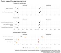 Members of both parties are similarly supportive of aggressive action against members or leaders of the other party; support for property crimes or threats and harassment online is higher than support for physical violence.