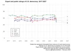 We have asked expert and public respondents to rate the overall performance of U.S. democracy on a 0–100 scale since 2017 and 2018, respectively. Our February 2025 survey also asked participants to report the rating they would expect to give the United States on the same scale in 2027. The figure below shows the time series (solid lines) and projected future ratings from our expert sample, the public overall, and for the public sample broken out by partisanship.