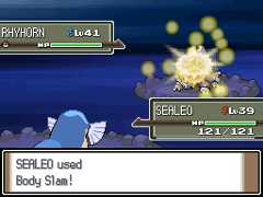 | Whiscash jumps into the air and lands on the opponent. | |||