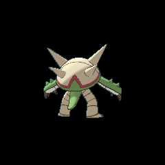 As Mega Chesnaught, it more greatly resembles an armored warrior, and its torso is now completely covered in white fur. Its claws are now colored gold, matching a three-pronged, crown-like adornment on its head, with three black indentations. The armored plate covering its head has extended slightly downward to better resemble a helmet. The green and red bands on its shell have changed to a dark maroon color, matching a cape-like extension of fur underneath. The front connecting piece of its shell armor is now shaped like a spade and more beveled. Along with its front spines and arm spines, the latter of which have fully extended into sharp spikes, it is now a dark green color. Its shell also stores two shield-like extensions on the sides. Each extension has two spikes opposite each other on the rim, along with multiple green circular portions that can also extend into spikes, as well as a smaller spike on the top center of the extension. Mega Chesnaught can use its shell extensions like a battle axe.