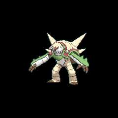 Chesnaught is a bipedal, mammalianPokémon with some plantlike features. There is fluffy white fur on its belly and fringing its face like a beard. It has a small, pink nose with a three-pointed patch of brown fur extending up its short snout and four pointed teeth. On top of its head is a plate of beige armor, similar to a helmet. It possesses a prominent domed, armor-like shell similar to that of a chestnut. The armor is beige with four large spines jutting out of the back. The armor is trimmed with red and green bands; the green is on the outermost edge. There is an additional spine protruding from the armor over each of Chesnaught's shoulders, which are connected by a green breastplate. Its body is colored similarly to the shell, and its long limbs and tail are banded with plates of armor. The top surfaces of the tail and arms are protected by green armor, and each arm has two small spines. It has three brown, clawed digits on its hands and feet. Its arms can be brought together to create a spike-covered, shield-like formation.