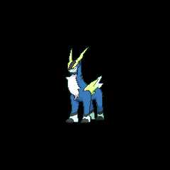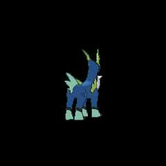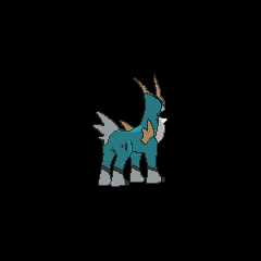 Cobalion is a quadrupedalPokémon that possesses traits of stags and goats. It is covered in aqua blue fur and has jagged yellow horns similar in shape to thunderbolts. Its snout is a lighter shade of blue than the rest of its fur, and there is a black blaze running from its nose to the back of its head. On its long neck and hind legs, there are small gray spots. It has a white tuft of fur under its neck, resembling a cravat. On its shoulder blades are yellow protrusions that resemble fins. Its tail resembles these protrusions, albeit in the same color as its snout. Cobalion's legs have black bands with lighter fur underneath and large black hooves. Cobalion's body is said to be made of steel.