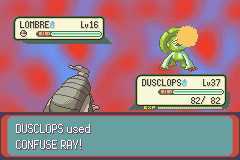 | Dusclops's eye glows red and emits a bright purple light from it, making the opponent confused. | |||