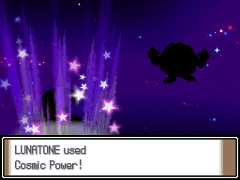 | Lunatone focuses its energy and its body starts to glow brightly as its defenses are boosted. | |||