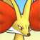 Delphox is a bipedal, fox-likePokémon. It is covered in a coat of long fur that resembles a robe. This "robe" is primarily dark red with red-orange, flame-like markings near its knees. There is also a thin tuft of white fur on its torso, which is flanked by yellow fur draping down from its shoulders. Its forearms feature long red fur resembling sleeves, and its hands and feet are dark gray with three clawed fingers and toes, respectively. A tail covered in yellow fur protrudes from its "robe". Its head is yellow with longer white fur on its cheeks. It has red eyes and a slender snout with a pinkish nose. Three tufts of red-orange fur protrude out of each ear. When its mouth is open, two pointed teeth can be seen on its upper jaw.