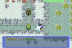 | Venomoth's eyes glow light blue while its opponent is using an attack. The opponent becomes outlined in light blue briefly and it stops using the attack. In addition, the opponent cannot use the attack for a while. | |||
