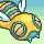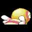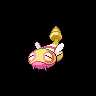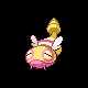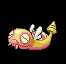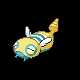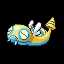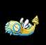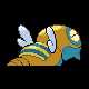 Dunsparce is aserpentine, and somewhatinsectoid,Pokémon with a primarily yellow body, blue underside, and blue-and-cream-striped back. Its head is round with a wide mouth extending under its jowls and curving up toward the middle of its face. Its chin is blue with two rounded prongs. Its eyes—round and rimmed with blue—are kept closed, revealing its cream-colored eyelids. On Dunsparce's upper back are two tiny white wings. Its body ends in a drill-like tail.