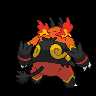In battle, Mega Emboar wields a serpentine, halberd spear shaped from blazing flames it emitted from its palms.[1] The spear is made of red fire with a yellow stripe running through the middle in its entirety. The upper half of the spear is more jagged than the lower half and ends in a split, with both ends curving slightly inward. This Pokémon is strongly driven by emotion, which are said to be running high due to the effects of Mega Evolution. As such, it tends to act alone and relentlessly challenges anyone it sees, but still retains a strong sense of duty, to the point of risking its own life in order to rescue an emperiled friend. The more riled up Mega Emboar is, the hotter the fire on its beard and spear burns, with the latter being able to reach temperatures of 18,000 degrees Fahrenheit (10,000 degrees Celsius).[1] When Mega Emboar unleashes a punch with its enhanced muscles, this single-fist blow is strong enough to destroy half of a reinforced concrete building.[2]