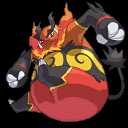 Emboar is a bulky, bipedalPokémon with pig-like features. It has a red nose, large bushy black eyebrows, and two tusks protruding from its lower jaw. Constantly burning flames cover the front of its neck and shoulders. The fire beard comes from the body flame within its body. It has short legs and thick arms. Its arms have orange upper portions while the legs have red upper portions. All of its limbs have black lower portions with thin yellow lines where the upper and lower colors meet. These lines are straight on the arms and spiked on the legs. The arms have red lines around the wrists and tufts of fur on the elbows. The hands are tipped with three claws, while the feet have two claws. A large, dark horizontal stripe on the chest of Emboar has swirled yellow markings. Its small tail ends in a tuft of hair.