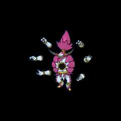 In the past, Hoopa's true power is said to have been sealed away in thePrison Bottle for the destruction it used to cause, reducing Hoopa to its smaller, Confined form; opening the bottle grants Hoopa its true form once again, but for only three days.[1][2] InHoopa and the Clash of Ages, the one who sealedHoopa's power in the Prison Bottle was a traveler namedGhris. The rings on Hoopa's body can openHyperspace Holes, which warp space and allow it to transport items,humans, andPokémon, including evenLegendary Pokémon, by passing them through it. As seen inHoopa and the Clash of Ages, summoning too many Legendaries has the dangerous side effect of creating a space-time distortion that'll destroy the area where they were summoned. As seen in various media, these holes allow it to access other worlds such as theDistortion World/Reverse World,Dialga's world,Palkia's world,Hyperspace Lumiose, and evenparallel timelines. With this power, it can cause mischief and take anything it wants for itself. Hoopa is connected to many strange events because of these mysterious powers. It is also said to have the power to bend dimensions. It is heavily implied to be the one causing many of themirage spots in theHoennregion, specifically the ones featuring ring-shaped portals.