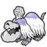 Houndstone is a large, skeletal, canine Pokémon. The top of its head and its humped back are covered in long, shaggy, whitish-gray fur that is a light purple color at the base, covering its eyes and its body. Its face has a large, protruding lower jaw, and its feet have three toes each. Below its fur, its legs and tail do not appear to be attached to a torso, instead floating in place relative to each other. Atop Houndstone's head is a large protuberance highly resembling a tombstone, which it prefers not to be touched. Houndstone spends much of its time buried below the ground, particularly in graveyards, with only its "tombstone" visible.