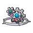 Klinklang is aPokémon resembling four interlocking gears, with six teeth on the smaller two gears and eight teeth on the larger gear. The fourth gear is on its lower side, and is red-topped with a thin, spiked rim below it. The red core is used to store energy gained from the rotating gears. This energy can be released through the spiked gear at the bottom. The teeth of the smaller gears are a light gray, while their central regions are much darker. The teeth of the larger gear are a medium gray and its central region is darker. The left eye of the smaller gear is a white "X", while its right eye has a black pupil and a white sclera. It has a round green nose and a small mouth. The largest gear appears to have a face with a black square for its right eye, a black circle for its left eye, and a sharply angled white frown.