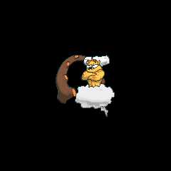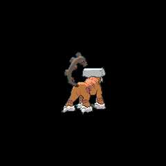 In Therian Forme, Landorus is an orange, lean, quadrupedal Pokémon with feline features. The horns on its head are now thinner and arranged closer together in a downwards arch. While its hair remains the same; its mustache now takes on a more fanged maw-like appearance, curving around its head to behind its ears, which have now become smaller and rounder. Its eyes remain yellow, but with larger irises that still lack visible pupils. Its chest remains broad and unchanged, while its navel is bejeweled with a beige gem. Landorus's back and lower legs are striped with dark pink, and its biceps and triceps are adorned with dark pink magatama designs. It has four trailing cloud-covered paws, each with three sharp dark pink claws. Its tail remains largely unchanged.