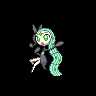 Meloetta is aPokémon that has a femininely anthropomorphic figure withmusical bar-style streaks in its hair,quarter notes (crotchets) (♩) for its arms and hands and pupil-less eyes resemblingwhole notes (semibreves). It has a jewel on its forehead and a black headpiece that seems to be shaped like atreble clef, which doubles as an attached microphone such as one often used by singers. Its ovular head seems to be a third of its body's height and about half its height in width. In its Aria Forme, Meloetta has light blue eyes and flowing, wavy hair with light-blue ovals that resemble whole notes. Its midriff and eyes match the Aria Forme's hair. It is agender-unknown species.
