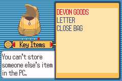 There are some items that cannot be stored in the PC. In the Generation I and II core series games, the player can store any item in their PC. In Ruby and Sapphire, the player can store any item other than theLetter, theDevon Goods, theRed Orb, or theBlue Orb. In FireRed and LeafGreen, the player can only store items from the Items Pocket. In Emerald, the player can store any item other thanHMs andKey Items.