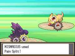 Pain Split adds the currentHP of the user and target Pokémon. It then divides this value by two, rounds down if necessary, and increases or decreases the HP of each Pokémon to become equal to the result (limited by each Pokémon's maximum HP). This setting of HP is not subject to effects such asCounter orBide. Pain Split does not employtype effectiveness, so it can also affectGhost-type Pokémon.